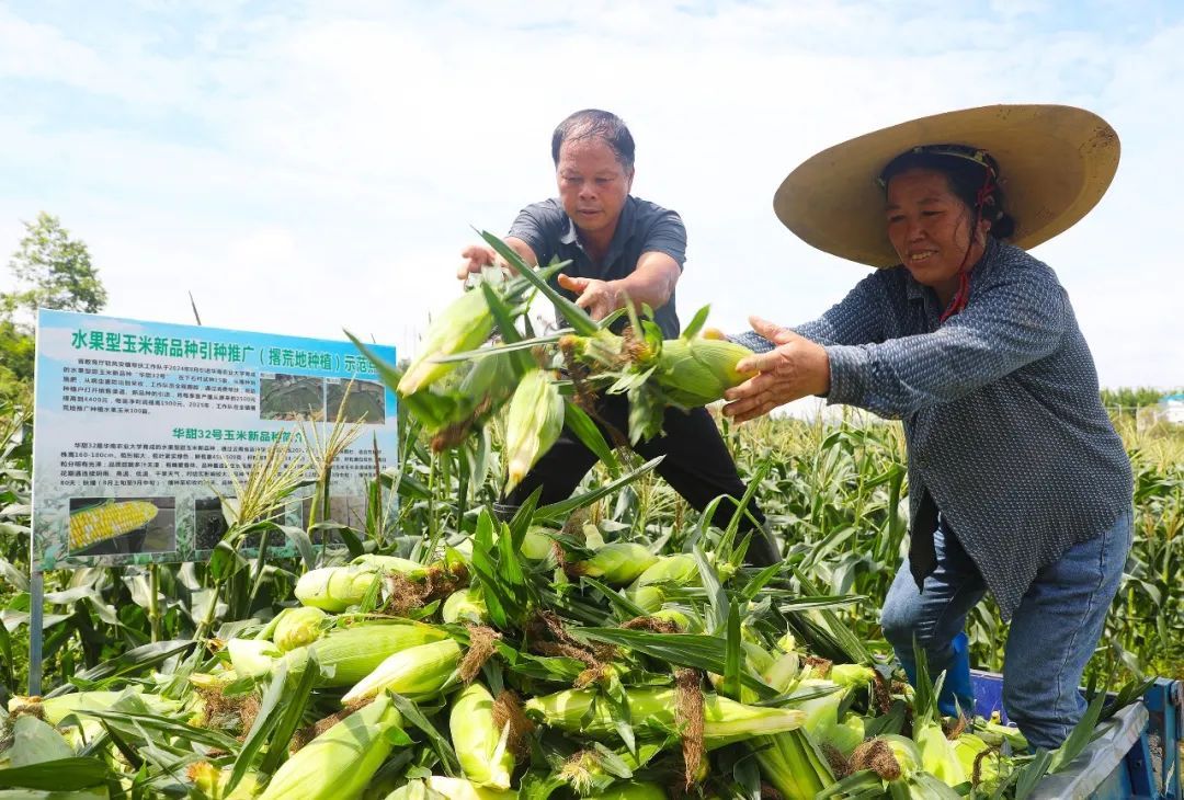 原来,这些玉米是水果型甜玉米新品种“华甜32号”。该品种由华南农业大学育成,由省教育厅驻紫金县凤安镇帮镇扶村工作队引进。凤安镇仁里村是引种推广(撂荒地种植)的示范点,今年首次流转12亩闲置土地进行试种。工作队队员、华南农业大学农学博士阙青敏表示,与普通玉米相比,“华甜32号”的生长期更短、经济效益更高,从播种到收获只需要75—80天,单季亩产量可达1200至1500公斤,亩产值从种普通玉米的2500元提高到4400元。